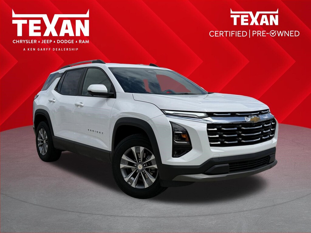 Clean CarFax!, Clean Vehicle History, Non Smoker Vehicle, LOCAL TRADE, ALL VEHICLES UNDERGO A 115 POINT SAFETY INSPECTION, Garff Certified Pre-Owned Certified, 2-Way Power Driver Lumbar Control Seat Adjuster, AutoSense Hands-Free Power Programmable Liftgate, Cabin Humidity & Windshield Sensor, Convenience Package II, Driver 8-Way Power Seat Adjuster, Dual-Zone Automatic Climate Control, Evotex Seat Trim, Front Fog Lamps, HD Surround Vision, Heated Wiper Park, Intermittent Front Rain-Sensing Wipers, Navigation System, Overhead Sunglass Storage, Preferred Equipment Group 1LT, Programmable Universal Home Remote, Rear Pedestrian Alert, Safety & Technology Package, Traffic Sign Recognition, Wireless Charging for Devices, 4-Wheel Disc Brakes, 5.81 Final Drive Axle Ratio, 6 Speakers, ABS brakes, Air Conditioning, Alloy wheels, AM/FM radio: SiriusXM, Auto High-beam Headlights, Brake assist, Bumpers: body-color, Cloth Seat Trim, Compass, Delay-off headlights, Driver 6-Way Manual Seat Adjuster, Driver door bin, Driver vanity mirror, Dual front impact airbags, Dual front side impact airbags, Electronic Stability Control, Emergency communication system: OnStar and Chevrolet connected services capable, Four wheel independent suspension, Front anti-roll bar, Front Bucket Seats, Front Center Armrest, Front Passenger 4-Way Manual Seat Adjuster, Front reading lights, Fully automatic headlights, Heated door mirrors, Heated Driver & Front Passenger Seats, Heated front seats, Heated steering wheel, Illuminated entry, Low tire pressure warning, Occupant sensing airbag, Outside temperature display, Overhead airbag, Overhead console, Panic alarm, Passenger door bin, Passenger vanity mirror, Power door mirrors, Power steering, Power windows, Premium audio system: Chevrolet Infotainment 3, Radio data system, Radio: 11.3 Diagonal Advanced Color LCD Display, Rear anti-roll bar, Rear Camera Mirror Washer, Rear reading lights, Rear seat center armrest, Rear window defroster, Rear window wiper, Remote keyless entry, Roof Rails, Security system, SiriusXM, Speed control, Speed-sensing steering, Split folding rear seat, Spoiler, Steering wheel mounted audio controls, Tachometer, Telescoping steering wheel, Tilt steering wheel, Traction control, Trip computer, Universal Home Remote Non-Functional, Variably intermittent wipers, Wheels: 17 Grazen Metallic Machined-Face Aluminum, Fully Serviced, Bluetooth, 1-Owner, Garff Certified, 2-Way Power Driver Lumbar Control Seat Adjuster, AutoSense Hands-Free Power Programmable Liftgate, Cabin Humidity & Windshield Sensor, Convenience Package II, Driver 8-Way Power Seat Adjuster, Dual-Zone Automatic Climate Control, Evotex Seat Trim, Front Fog Lamps, HD Surround Vision, Heated Wiper Park, Intermittent Front Rain-Sensing Wipers, Navigation System, Overhead Sunglass Storage, Preferred Equipment Group 1LT, Programmable Universal Home Remote, Rear Pedestrian Alert, Safety & Technology Package, Traffic Sign Recognition, Wireless Charging for Devices. CARFAX One-Owner. Texan Dodge Chrysler Jeep Ram is delighted to offer this gorgeous-looking 2025 Chevrolet Equinox LT.In addition to transparent, no hassle pricing and upfront no hassle trade evaluation.....We provide an enjoyably brief and easy Sales Experience...Your Pace...Your Way....CONTACT US AT (281)359-7100 Advertised prices exclude leases. Vehicle may or may not be equipped with vehicle protection products or accessories that are not required for purchase.