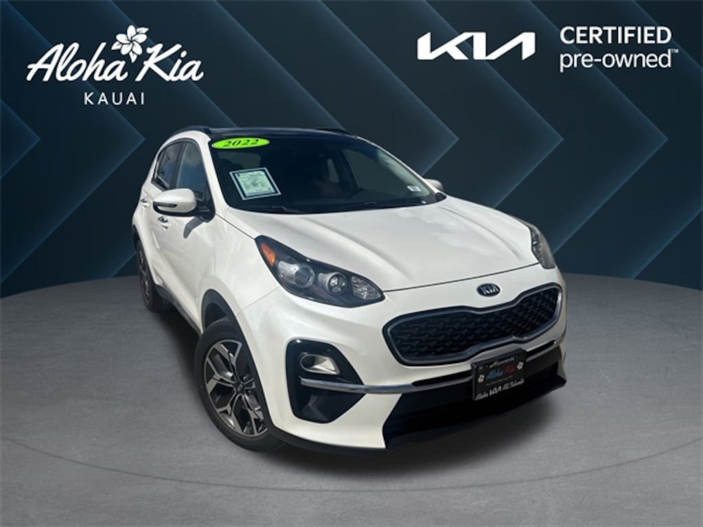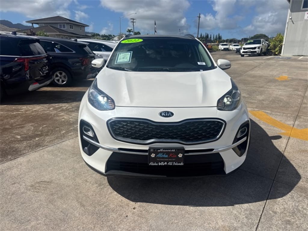 Certified. Snow White Pearl 2022 Kia Sportage EX FWD 6-Speed Automatic Electronic with Overdrive 18" Machine-Finished Alloy Wheels, 4-Wheel Disc Brakes, 6 Speakers, ABS brakes, Air Conditioning, Alloy wheels, AM/FM radio, Apple CarPlay & Android Auto, Auto High-beam Headlights, Automatic temperature control, Axle Ratio: 3.064, Brake assist, Bumpers: body-color, Cargo Cover, Cargo Tray, Carpeted Floor Mats, Delay-off headlights, Driver door bin, Driver vanity mirror, Dual front impact airbags, Dual front side impact airbags, Electronic Stability Control, Exterior Parking Camera Rear, Four wheel independent suspension, Front anti-roll bar, Front Bucket Seats, Front Center Armrest, Front dual zone A/C, Front fog lights, Front reading lights, Fully automatic headlights, Heated door mirrors, Heated Front Bucket Seats, Heated front seats, Illuminated entry, Leather Shift Knob, Leather steering wheel, Leatherette Seat Trim, Low tire pressure warning, Occupant sensing airbag, Outside temperature display, Overhead airbag, Overhead console, Panic alarm, Passenger door bin, Passenger vanity mirror, Power door mirrors, Power driver seat, Power Liftgate, Power moonroof, Power steering, Power windows, Radio: AM/FM Audio System, Rear anti-roll bar, Rear Bumper Applique, Rear seat center armrest, Rear window defroster, Rear window wiper, Remote keyless entry, Roof rack: rails only, Security system, Speed control, Speed-sensing steering, Split folding rear seat, Spoiler, Steering wheel mounted audio controls, Tachometer, Telescoping steering wheel, Tilt steering wheel, Traction control, Trip computer, Turn signal indicator mirrors, Variably intermittent wipers. 2.4L I4 DGI DOHC 16V