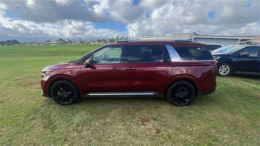 Certified. Flare Red 2023 Kia Carnival SX Prestige FWD 8-Speed Automatic 12 Speakers, 3.51 Axle Ratio, 3rd row seats: split-bench, 4-Wheel Disc Brakes, ABS brakes, Air Conditioning, Alloy wheels, AM/FM radio: SiriusXM, Apple CarPlay & Android Auto, Auto High-beam Headlights, Auto-dimming Rear-View mirror, Automatic temperature control, Brake assist, Bumpers: body-color, Compass, Delay-off headlights, Driver door bin, Driver vanity mirror, Driver's Seat Integrated Memory System, Dual front impact airbags, Dual front side impact airbags, Electronic Stability Control, Emergency communication system, Exterior Parking Camera Rear, Four wheel independent suspension, Front anti-roll bar, Front Bucket Seats, Front Center Armrest, Front dual zone A/C, Front fog lights, Front reading lights, Fully automatic headlights, Garage door transmitter: HomeLink, Heated & Ventilated Front Bucket Seats, Heated door mirrors, Heated front seats, Heated steering wheel, Illuminated entry, Knee airbag, Leather Seat Trim, Leather Shift Knob, Leather steering wheel, Low tire pressure warning, Memory seat, Navigation System, Occupant sensing airbag, Outside temperature display, Overhead airbag, Overhead console, Panic alarm, Passenger door bin, Passenger vanity mirror, Power 2nd-Row Moonroof, Power door mirrors, Power driver seat, Power Liftgate, Power moonroof, Power passenger seat, Power steering, Power windows, Radio: AM/FM/HD Audio System, Rear air conditioning, Rear anti-roll bar, Rear reading lights, Rear Seat Entertainment Package, Rear window defroster, Rear window wiper, Reclining 3rd row seat, Remote keyless entry, Roof rack: rails only, Security system, Speed control, Speed-sensing steering, Split folding rear seat, Spoiler, Steering wheel mounted audio controls, Tachometer, Telescoping steering wheel, Tilt steering wheel, Traction control, Trip computer, Turn signal indicator mirrors, Variably intermittent wipers, Ventilated front seats, Wheels: 7.5J x 19" Black Painted Alloy. V6