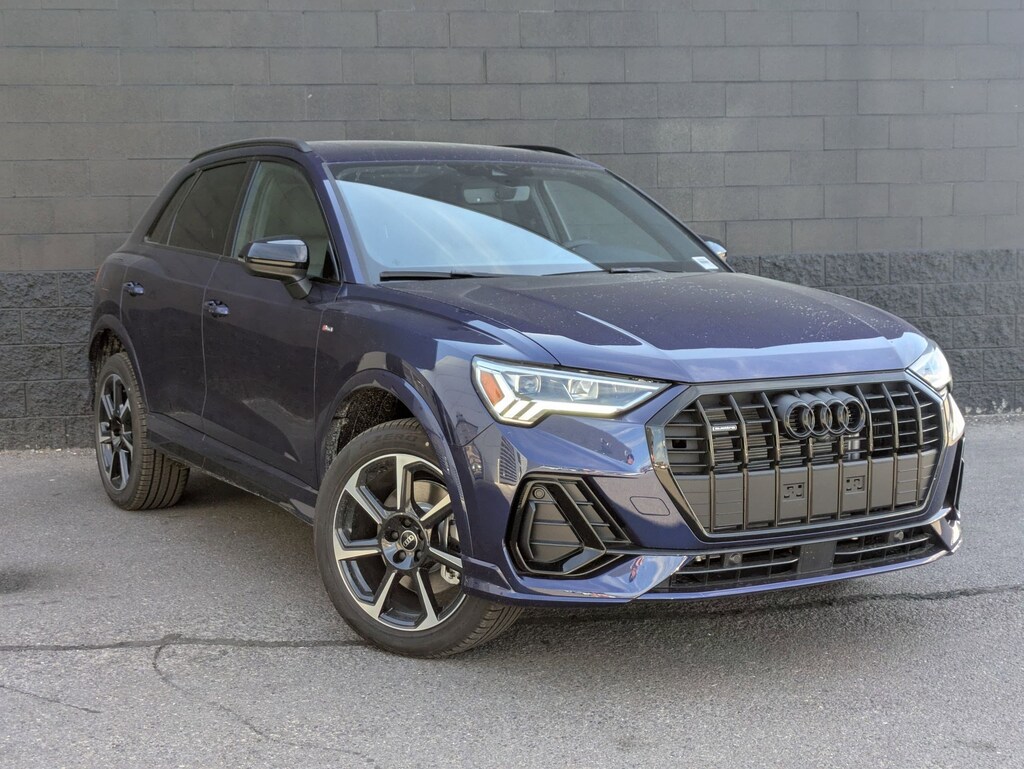 Navarra Blue Metallic 2025 Audi Q3 Premium Plus S Line quattro quattro 8-Speed Automatic with Tiptronic 2.0L 4-Cylinder TFSI 10 Speakers, 4-Wheel Disc Brakes, ABS brakes, Air Conditioning, Alloy wheels, AM/FM radio, Audi smartphone interface (Apple CarPlay/Android Auto), Auto High-beam Headlights, Automatic temperature control, Brake assist, Bumpers: body-color, Delay-off headlights, Driver door bin, Driver vanity mirror, Dual front impact airbags, Dual front side impact airbags, Electronic Stability Control, Emergency communication system: Audi connect CARE, Exterior Parking Camera Rear, Four wheel independent suspension, Front anti-roll bar, Front Bucket Seats, Front Center Armrest, Front dual zone A/C, Front fog lights, Front reading lights, Fully automatic headlights, Heated door mirrors, Heated Front Bucket Seats, Heated front seats, Illuminated entry, Knee airbag, Leather Seating Surfaces, Leather Shift Knob, Leather steering wheel, Low tire pressure warning, Occupant sensing airbag, Outside temperature display, Overhead airbag, Overhead console, Panic alarm, Passenger door bin, Passenger vanity mirror, Power door mirrors, Power driver seat, Power Liftgate, Power moonroof: Panoramic, Power passenger seat, Power steering, Power windows, Radio data system, Radio: Audi Sound System, Rain sensing wipers, Rear air conditioning, Rear anti-roll bar, Rear fog lights, Rear reading lights, Rear seat center armrest, Rear window defroster, Rear window wiper, Remote keyless entry, Speed control, Speed-sensing steering, Split folding rear seat, Spoiler, Steering wheel mounted audio controls, Tachometer, Telescoping steering wheel, Tilt steering wheel, Traction control, Trip computer, Turn signal indicator mirrors, Variably intermittent wipers, Wheels: 18 5-V-Spoke-S Design.20/28 City/Highway MPGAdvertised Prices do not include any dealer installed options and advertised prices exclude leases.