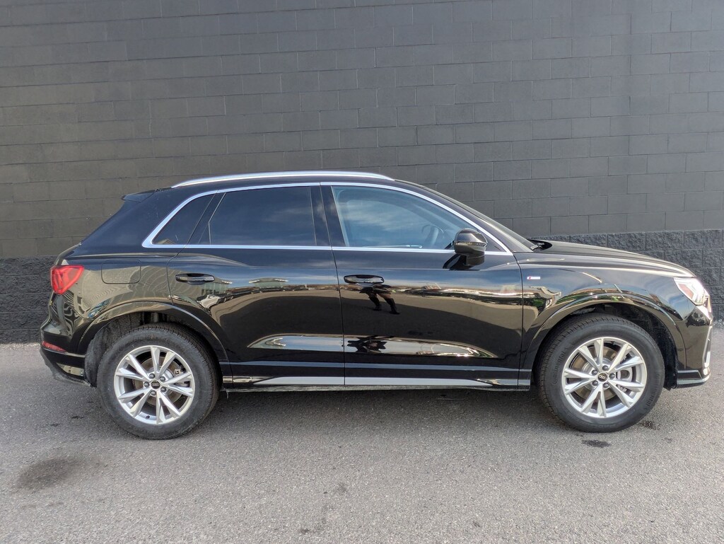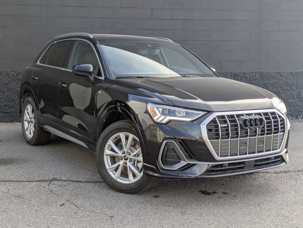 Mythos Black Metallic 2025 Audi Q3 Premium Plus S Line quattro quattro 8-Speed Automatic with Tiptronic 2.0L 4-Cylinder TFSI 10 Speakers, 4-Wheel Disc Brakes, ABS brakes, Air Conditioning, Alloy wheels, AM/FM radio, Audi smartphone interface (Apple CarPlay/Android Auto), Auto High-beam Headlights, Automatic temperature control, Brake assist, Bumpers: body-color, Delay-off headlights, Driver door bin, Driver vanity mirror, Dual front impact airbags, Dual front side impact airbags, Electronic Stability Control, Emergency communication system: Audi connect CARE, Exterior Parking Camera Rear, Four wheel independent suspension, Front anti-roll bar, Front Bucket Seats, Front Center Armrest, Front dual zone A/C, Front fog lights, Front reading lights, Fully automatic headlights, Heated door mirrors, Heated Front Bucket Seats, Heated front seats, Illuminated entry, Knee airbag, Leather Seating Surfaces, Leather Shift Knob, Leather steering wheel, Low tire pressure warning, Occupant sensing airbag, Outside temperature display, Overhead airbag, Overhead console, Panic alarm, Passenger door bin, Passenger vanity mirror, Power door mirrors, Power driver seat, Power Liftgate, Power moonroof: Panoramic, Power passenger seat, Power steering, Power windows, Radio data system, Radio: Audi Sound System, Rain sensing wipers, Rear air conditioning, Rear anti-roll bar, Rear fog lights, Rear reading lights, Rear seat center armrest, Rear window defroster, Rear window wiper, Remote keyless entry, Speed control, Speed-sensing steering, Split folding rear seat, Spoiler, Steering wheel mounted audio controls, Tachometer, Telescoping steering wheel, Tilt steering wheel, Traction control, Trip computer, Turn signal indicator mirrors, Variably intermittent wipers, Wheels: 18 5-V-Spoke-S Design.20/28 City/Highway MPGAdvertised Prices do not include any dealer installed options and advertised prices exclude leases.