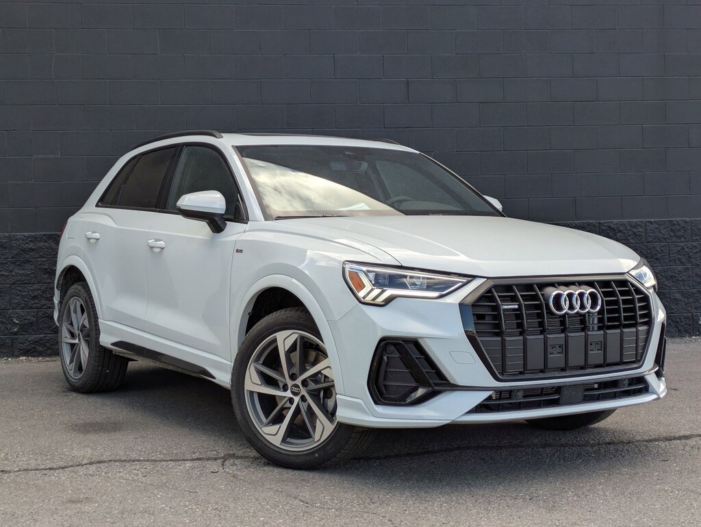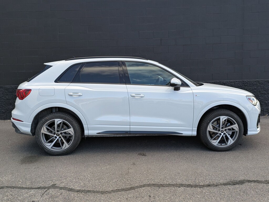 Glacier White Metallic 2025 Audi Q3 Premium S Line quattro quattro 8-Speed Automatic with Tiptronic 2.0L 4-Cylinder TFSI 10 Speakers, 4-Wheel Disc Brakes, ABS brakes, Air Conditioning, Alloy wheels, AM/FM radio, Audi smartphone interface (Apple CarPlay/Android Auto), Auto High-beam Headlights, Automatic temperature control, Brake assist, Bumpers: body-color, Delay-off headlights, Driver door bin, Driver vanity mirror, Dual front impact airbags, Dual front side impact airbags, Electronic Stability Control, Emergency communication system: Audi connect CARE, Exterior Parking Camera Rear, Four wheel independent suspension, Front anti-roll bar, Front Bucket Seats, Front Center Armrest, Front dual zone A/C, Front fog lights, Front reading lights, Fully automatic headlights, Heated door mirrors, Heated Front Bucket Seats, Heated front seats, Illuminated entry, Knee airbag, Leather Seating Surfaces, Leather Shift Knob, Leather steering wheel, Low tire pressure warning, Occupant sensing airbag, Outside temperature display, Overhead airbag, Overhead console, Panic alarm, Passenger door bin, Passenger vanity mirror, Power door mirrors, Power driver seat, Power Liftgate, Power moonroof: Panoramic, Power passenger seat, Power steering, Power windows, Radio data system, Radio: Audi Sound System, Rain sensing wipers, Rear air conditioning, Rear anti-roll bar, Rear fog lights, Rear reading lights, Rear seat center armrest, Rear window defroster, Rear window wiper, Remote keyless entry, Speed control, Speed-sensing steering, Split folding rear seat, Spoiler, Steering wheel mounted audio controls, Tachometer, Telescoping steering wheel, Tilt steering wheel, Traction control, Trip computer, Turn signal indicator mirrors, Variably intermittent wipers, Wheels: 18 5-V-Spoke-S Design.20/28 City/Highway MPGAdvertised Prices do not include any dealer installed options and advertised prices exclude leases.