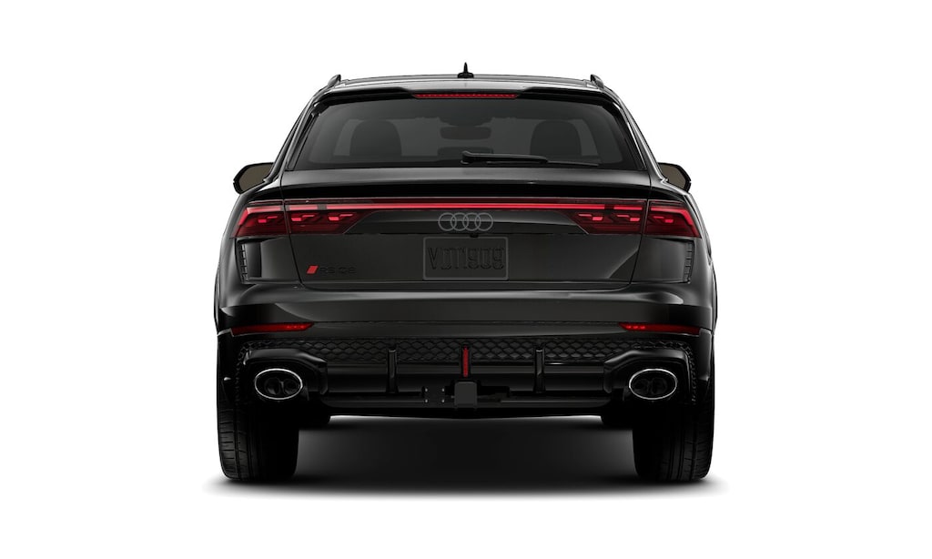 Mythos Black Metallic 2025 Audi RS Q8 performance 4.0T quattro quattro 8-Speed Automatic with Tiptronic 4.0L V8 Turbocharged DOHC 32V LEV3-ULEV125 631hp 17 Speakers, 4-Wheel Disc Brakes, ABS brakes, Adaptive suspension, Air Conditioning, Alloy wheels, AM/FM radio: SiriusXM w/ 360L, Auto High-beam Headlights, Auto-dimming door mirrors, Auto-dimming Rear-View mirror, Auto-leveling suspension, Automatic temperature control, Bang & Olufsen Premium Sound System w/3D Sound, Brake assist, Bumpers: body-color, Ceramic disc brakes: front and rear, Compass, Delay-off headlights, Driver door bin, Driver vanity mirror, Dual front impact airbags, Dual front side impact airbags, Electronic Stability Control, Emergency communication system: Audi connect CARE, Exterior Parking Camera Rear, Four wheel independent suspension, Front anti-roll bar, Front Bucket Seats, Front Center Armrest, Front dual zone A/C, Front fog lights, Front reading lights, Fully automatic headlights, Garage door transmitter: HomeLink, Headlight cleaning, Heated & Ventilated Sports Seats Plus, Heated door mirrors, Heated front seats, Heated steering wheel, Illuminated entry, Leather Shift Knob, Leather steering wheel, Low tire pressure warning, Memory seat, Navigation system: Audi MMI Navigation plus with Touch Response, Occupant sensing airbag, Outside temperature display, Overhead airbag, Overhead console, Panic alarm, Passenger door bin, Passenger vanity mirror, Power door mirrors, Power driver seat, Power Liftgate, Power moonroof: Panoramic, Power passenger seat, Power steering, Power windows, Radio data system, Radio: MMI Navigation Plus, Rain sensing wipers, Rear air conditioning, Rear anti-roll bar, Rear dual zone A/C, Rear fog lights, Rear reading lights, Rear seat center armrest, Rear side impact airbag, Rear Window Blind, Rear window defroster, Rear window wiper, Remote keyless entry, Security system, Speed control, Speed-sensing steering, Split folding rear seat, Spoiler, Steering wheel memory, Steering wheel mounted audio controls, Tachometer, Telescoping steering wheel, Tilt steering wheel, Traction control, Trip computer, Turn signal indicator mirrors, Valcona Leather Seating Surfaces, Variably intermittent wipers, Ventilated front seats, Wheels: 22 10-Spoke-Star Design.Advertised Prices do not include any dealer installed options and advertised prices exclude leases.