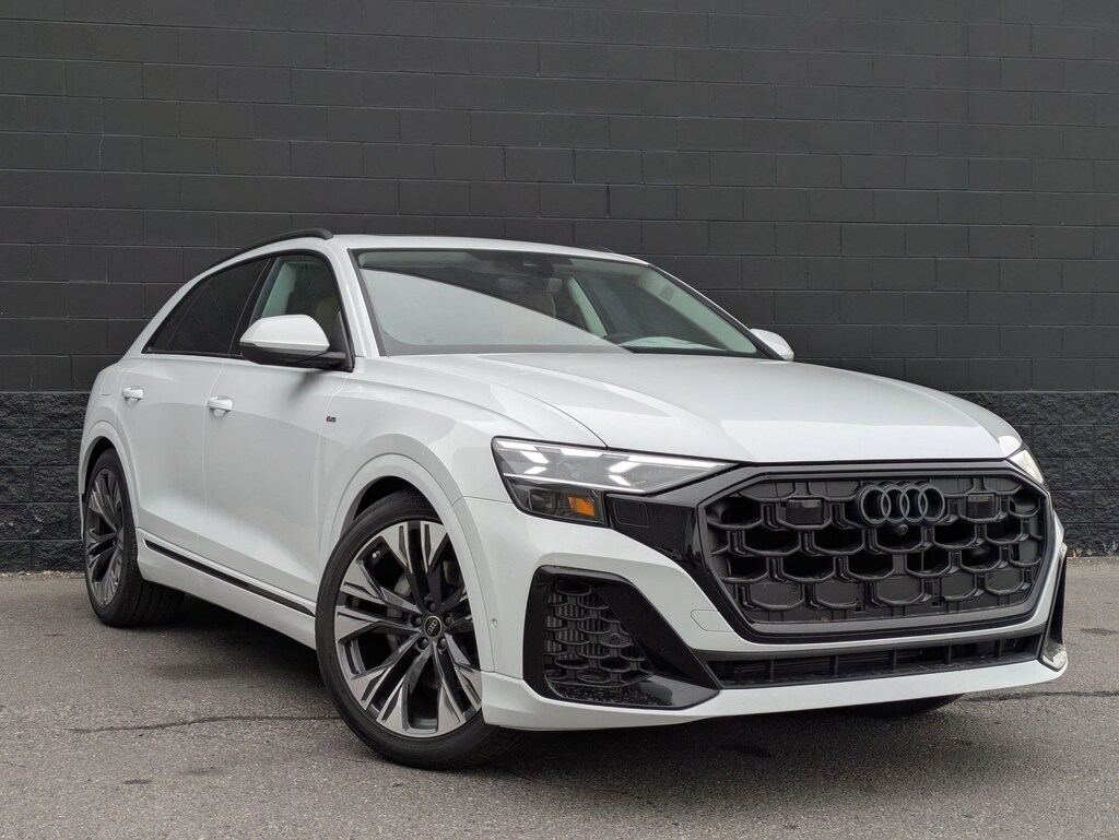 Glacier White Metallic 2026 Audi Q8 quattro quattro 8-Speed Automatic with Tiptronic 3.0L TFSI 10 Speakers, 4-Wheel Disc Brakes, ABS brakes, Adaptive suspension, Air Conditioning, Alloy wheels, AM/FM radio, Audi Sound System, Auto High-beam Headlights, Auto-dimming door mirrors, Auto-dimming Rear-View mirror, Automatic temperature control, Brake assist, Bumpers: body-color, Compass, Delay-off headlights, Driver door bin, Driver vanity mirror, Dual front impact airbags, Dual front side impact airbags, Electronic Stability Control, Emergency communication system: Audi connect CARE, Exterior Parking Camera Rear, Four wheel independent suspension, Front anti-roll bar, Front Bucket Seats, Front Center Armrest, Front dual zone A/C, Front fog lights, Front reading lights, Fully automatic headlights, Garage door transmitter: HomeLink, Genuine wood door panel insert, Heated door mirrors, Heated Front Bucket Seats, Heated front seats, Illuminated entry, Leather Seating Surfaces, Leather Shift Knob, Leather steering wheel, Low tire pressure warning, Memory seat, Navigation system: Audi MMI Navigation plus with Touch Response, Occupant sensing airbag, Outside temperature display, Overhead airbag, Overhead console, Panic alarm, Passenger door bin, Passenger vanity mirror, Power door mirrors, Power driver seat, Power Liftgate, Power moonroof: Panoramic, Power passenger seat, Power steering, Power windows, Radio data system, Radio: Audi MMI Navigation Plus with MMI Touch Response, Rain sensing wipers, Rear air conditioning, Rear anti-roll bar, Rear fog lights, Rear reading lights, Rear seat center armrest, Rear side impact airbag, Rear window defroster, Rear window wiper, Remote keyless entry, Security system, Speed control, Speed-sensing steering, Split folding rear seat, Spoiler, Steering wheel memory, Steering wheel mounted audio controls, Tachometer, Telescoping steering wheel, Tilt steering wheel, Traction control, Trip computer, Turn signal indicator mirrors, Variably intermittent wipers, Wheels: 21 5-W-Spoke Design with Bicolor Finish.Advertised Prices do not include any dealer installed options and advertised prices exclude leases.
