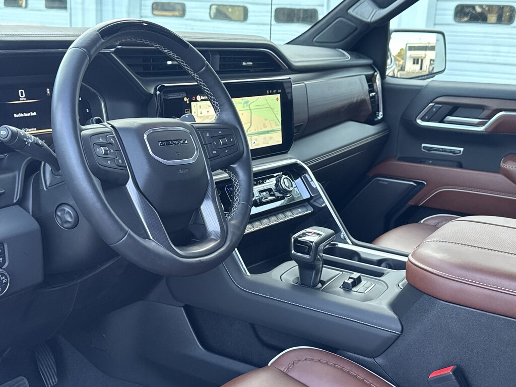 10-Speed Automatic, 4WD, Alpine Umber Leather, 12 Speakers, 120 Point Safety Inspection, 120-Volt Bed Mounted Power Outlet, 120-Volt Interior Power Outlet, 16-Way Power Driver Seat Adjuster w/Lumbar, 16-Way Power Passenger Seat Adjuster w/Lumbar, 170 Amp Alternator, 2 Charge/Data USB Ports Inside Center Console, 2 Type-C Charge-Only Rear USB Ports, 2 USB Ports, 22 WHEELS, 3.23 Rear Axle Ratio, 4-Wheel Disc Brakes, ABS brakes, Adaptive suspension, Air Conditioning, Alloy wheels, AM/FM radio: SiriusXM with 360L, Apple CarPlay/Android Auto, Auto High-beam Headlights, Auto-dimming door mirrors, Auto-dimming Rear-View mirror, Auto-Locking Rear Differential, Automatic temperature control, Bed View Camera, BLUETOOTH / HANDSFREE, Body Color Wheel Arch Moldings (LPO), Bose Premium Series w/12-Speaker System, Brake assist, Buckle to Drive, Bumpers: body-color, Carbon Fiber Composite Bed, Chrome Recovery Hooks, CLEAN CARFAX!, Color-Keyed Carpeting Floor Covering, Compass, Deep-Tinted Glass, Delay-off headlights, Denali Premium Suspension w/Adaptive Ride Control, Driver door bin, Driver Memory, Driver vanity mirror, Dual Active Exhaust, Dual front impact airbags, Dual front side impact airbags, Electric Rear-Window Defogger, Electronic Stability Control, Emergency communication system: OnStar and GMC connected services capable, Enhanced Automatic Emergency Braking, Floor-Mounted Center Console, Following Distance Indicator, Forward Collision Alert, Front anti-roll bar, Front Bucket Seats, Front Center Armrest, Front dual zone A/C, Front fog lights, Front Pedestrian Braking, Front Rain-Sensing Wipers, Front reading lights, Front wheel independent suspension, Full Grain Leather Seat Trim, Fully automatic headlights, Garage door transmitter, Genuine wood console insert, Genuine wood dashboard insert, Genuine wood door panel insert, GMC Connected Access Capable, HD Surround Vision, Heads-Up Display, Heated 2nd Row Outboard Seats, Heated door mirrors, Heated Driver & Front Outboard Passenger Seating, Heated front seats, Heated rear seats, Heated steering wheel, Heavy-Duty Air Filter, Hill Descent Control, Hitch View, Illuminated entry, In-Vehicle Trailering System App, Integrated Trailer Brake Controller, IntelliBeam Automatic High Beam On/Off, Keyless Open & Start, Lane Keep Assist w/Lane Departure Warning, LED Cargo Area Lighting, LOCAL TRADE IN!, Low tire pressure warning, Memory seat, Multicolor 15 Diagonal Head-Up Display, MultiPro Tailgate Audio System by Kicker (LPO), NAVIGATION, Navigation System, NON SMOKER VEHICLE, Occupant sensing airbag, OnStar & GMC Connected Services Capable, Outside temperature display, Overhead airbag, Overhead console, Panic alarm, Passenger door bin, Passenger vanity mirror, Perimeter Lighting, Power Door Locks, Power door mirrors, Power driver seat, Power Front Passenger Windows w/Express Up/Down, Power Front Windows w/Driver Express Up/Down, Power moonroof, Power passenger seat, Power Rake & Telescoping Steering Column, Power Rear Windows w/Express Down, Power Sliding Rear Window w/Rear Defogger, Power steering, Power Sunroof, Power windows, Preferred Equipment Group 5SB, Premium audio system: GMC Infotainment System, PROFESSIONALLY DETAILED FOR DELIVERY!, Push Button Start, Radio data system, Radio: Premium GMC Infotainment Audio System, Rain sensing wipers, Rear Cross Traffic Braking, Rear Pedestrian Detection, Rear reading lights, Rear seat center armrest, Rear step bumper, Rear Wheelhouse Liners, Rear window defroster, Remote keyless entry, Remote Vehicle Starter System, Safety Alert Seat, Security system, SiriusXM w/360L, Speed control, Speed-sensing steering, Split folding rear seat, Spray-On Pickup Bedliner w/Denali Logo, Steering Wheel Audio Controls, Steering wheel mounted audio controls, SUNROOF/MOONROOF, Super Cruise, SUPER LOW MILES!, Tachometer, Telescoping steering wheel, Theft Deterrent System (Unauthorized Entry), Tilt steering wheel, Traction control, Trailer Camera Provisions, Trailer Si
