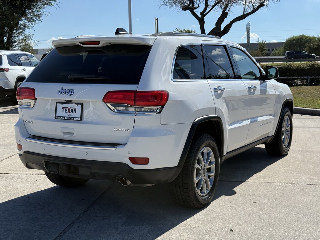 Recent Arrival! 18 x 8.0 Aluminum Polished Wheels, 3.45 Rear Axle Ratio, 4-Wheel Disc Brakes, 6 Month Trial (Registration Required), 6 Speakers, 7 & 4 Pin Wiring Harness, 8.4 Touchscreen Display, ABS brakes, Air Conditioning, Alloy wheels, AM/FM radio: SiriusXM, Anti-whiplash front head restraints, Audio memory, Auto-dimming door mirrors, Auto-dimming Rear-View mirror, Automatic temperature control, Brake assist, Bumpers: body-color, Class IV Receiver Hitch, Compass, Delay-off headlights, Driver door bin, Driver vanity mirror, Dual front impact airbags, Dual front side impact airbags, Electronic Stability Control, Exterior Parking Camera Rear, For Details Visit DriveUconnect.com, Four wheel independent suspension, Front anti-roll bar, Front Bucket Seats, Front Center Armrest w/Storage, Front dual zone A/C, Front fog lights, Front reading lights, Fully automatic headlights, Garage door transmitter, GPS Antenna Input, Heated door mirrors, Heated front seats, Heated rear seats, Heated steering wheel, High Pressure Tires Tracking, Illuminated entry, Integrated Voice Command w/Bluetooth, Knee airbag, Leather Shift Knob, Low tire pressure warning, Memory seat, Nav-Capable! See Dealer for Details, Normal Duty Suspension, Occupant sensing airbag, Outside temperature display, Overhead airbag, Overhead console, Panic alarm, Passenger door bin, Passenger vanity mirror, Power door mirrors, Power driver seat, Power Liftgate, Power passenger seat, Power steering, Power windows, Premium Leather Trimmed Bucket Seats, Quick Order Package 23H, Radio data system, Radio: Uconnect 5.0, Radio: Uconnect 8.4, Rear anti-roll bar, Rear Load Leveling Suspension, Rear Parking Sensors, Rear reading lights, Rear seat center armrest, Rear window defroster, Rear window wiper, Rear-View Auto-Dimming Mirror w/Microphone, Remote keyless entry, Roadside Assistance & 9-1-1 Call, Roof rack: rails only, Security system, SIRIUSXM Satellite Radio, Speed control, Speed-Sensitive Wipers, Split folding rear seat, Spoiler, Steering wheel mounted audio controls, Tachometer, Telescoping steering wheel, Tilt steering wheel, Traction control, Trailer Tow Group IV, Trip computer, Turn signal indicator mirrors, Uconnect Access, Variably intermittent wipers.Texan GMC Buick is pleased to offer this handsome 2015 Jeep Grand Cherokee Limited. 4WD Bright White ClearcoatCertified.Awards: * Green Car Journal 2015 Green SUV of the YearBased on 2017 EPA mileage ratings. Use for comparison purposes only. Your mileage will vary depending on how you drive and maintain your vehicle, driving conditions and other factors.Service Loaners...Free WiFi.....Business Center....Roadside Assistance...All Included!! Our Mission: To be the most esteemed automotive group in the eyes of our employees, customers, and partners. Our Promise: We listen and provide a trusted, easy, and enjoyable experience. Our Philosophy: We create lifetime customers. Advertised Prices do not include any dealer installed options and advertised prices exclude leases.Reviews: * The Jeep Grand Cherokee SUV comes closest to having it all: a high-tech and comfortable 5-passenger interior, genuine off-road capability and an array of engine choices. If you take the road less traveled, this is your ride. Source: KBB.com * Strong and fuel-efficient engine lineup, including diesel V6; upscale interior; plenty of luxury and technology-oriented features; irrefutable off-road ability; outlandish SRT model. Source: Edmunds