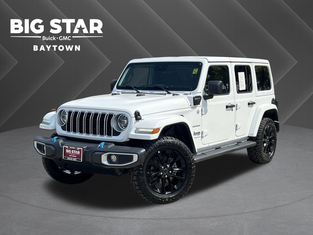 2.0L I4 DOHC, 12.3 Touchscreen Display, 120 Point Safety Inspection, 20 WHEELS, 4-Wheel Disc Brakes, 4G LTE Wi-Fi Hot Spot, 8 Speakers, ABS brakes, Air Conditioning, Alloy wheels, AM/FM radio: SiriusXM, Apple CarPlay, Apple CarPlay/Android Auto, Automatic temperature control, Brake assist, CLEAN CARFAX!, Cloth Low-Back Bucket Seats, Compass, Delay-off headlights, Disassociated Touchscreen Display, Driver door bin, Dual front impact airbags, Dual front side impact airbags, Electronic Stability Control, Emergency communication system: Jeep Connect, Front anti-roll bar, Front Bucket Seats, Front Center Armrest w/Storage, Front dual zone A/C, Front fog lights, Front reading lights, Fully automatic headlights, Google Android Auto, Heated door mirrors, Heated front seats, Heated steering wheel, Illuminated entry, Integrated Center Stack Radio, Integrated roll-over protection, Integrated Voice Command w/Bluetooth, LOCAL TRADE IN!, Low tire pressure warning, NON SMOKER VEHICLE, Occupant sensing airbag, Outside temperature display, Overhead airbag, Panic alarm, ParkView Rear Back-Up Camera, Passenger door bin, Passenger vanity mirror, Power door mirrors, Power steering, Power windows, PROFESSIONALLY DETAILED FOR DELIVERY!, Quick Order Package 29P Sahara, Radio data system, Radio: Uconnect 5 w/12.3 Display, Rear anti-roll bar, Rear reading lights, Rear seat center armrest, Remote keyless entry, Security system, Speed control, Split folding rear seat, Sport Suspension, Steering wheel mounted audio controls, SUPER LOW MILES!, Tachometer, Telescoping steering wheel, Tilt steering wheel, Traction control, Trip computer, Variably intermittent wipers, Voltmeter, Wheels: 20 x 8 Painted Black Aluminum. Clean CARFAX. Certified.Big Star Buick GMC is honored to offer this outstanding-looking and fun 2024 Jeep Wrangler. Sahara 4xe 4WD Bright White Clearcoat CARFAX One-Owner.Why should you buy from Big Star GMC Buick? Our unmatched service and diverse New and Used Buick, GMC, Cars and Trucks inventory have set us apart as the preferred dealer in Baytown. Visit us today to discover why we have the best reputation in the Baytown area. Advertised Prices do not include any dealer installed options and advertised prices exclude leases.