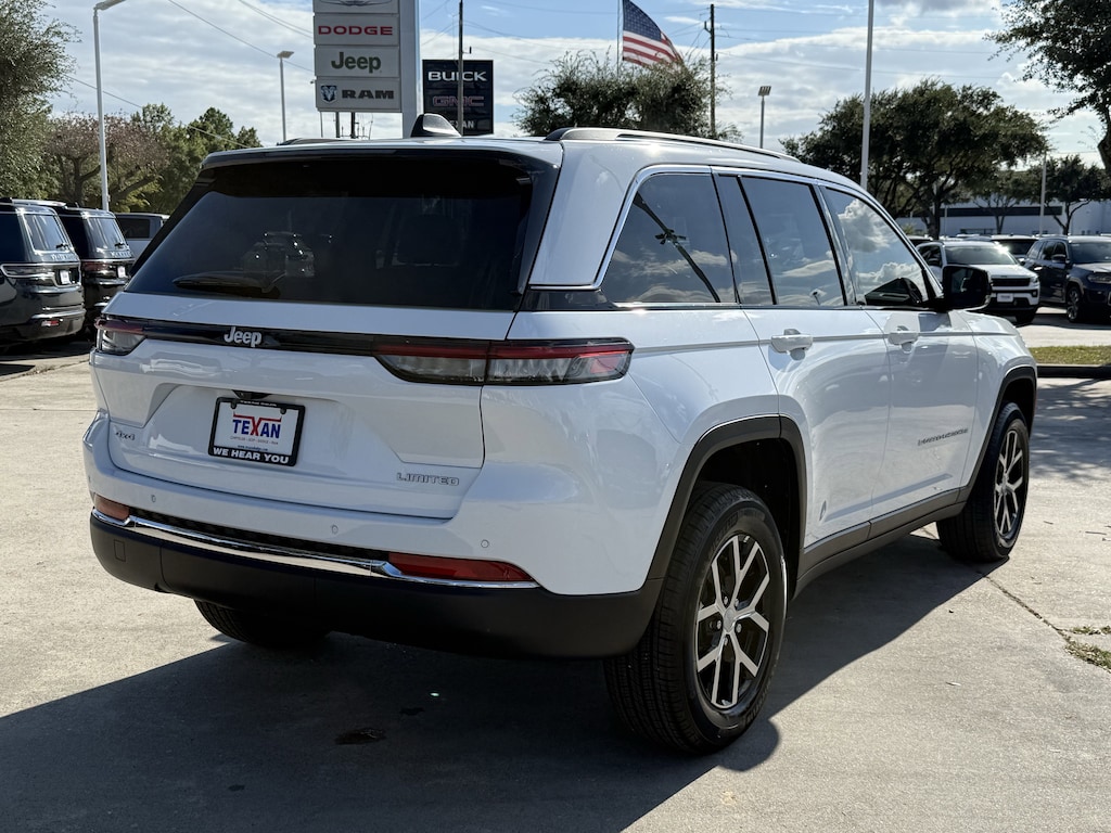 Clean CarFax!, Clean Vehicle History, Non Smoker Vehicle, ALL VEHICLES UNDERGO A 115 POINT SAFETY INSPECTION, Carfax 1 Owner, 4WD, 4-Wheel Disc Brakes, 6 Speakers, ABS brakes, Active Noise Control System, AM/FM radio: SiriusXM with 360L, Anti-whiplash front head restraints, Audio memory, Auto High-beam Headlights, Automatic temperature control, Brake assist, Bumpers: body-color, Delay-off headlights, Driver door bin, Driver vanity mirror, Dual front impact airbags, Dual front side impact airbags, Electronic Stability Control, Emergency communication system, Four wheel independent suspension, Front anti-roll bar, Front Bucket Seats, Front Center Armrest w/Storage, Front dual zone A/C, Front fog lights, Front License Plate Bracket, Front reading lights, Fully automatic headlights, Garage door transmitter, Heated door mirrors, Heated front seats, Heated rear seats, Heated steering wheel, Illuminated entry, Knee airbag, Low tire pressure warning, Memory seat, Navigation System, Normal Duty Suspension, Occupant sensing airbag, Overhead airbag, Overhead console, Panic alarm, ParkView Rear Back-Up Camera, Passenger door bin, Power door mirrors, Power driver seat, Power Liftgate, Power passenger seat, Quick Order Package 22E, Radio: Uconnect 5 Nav w/10.1 Display, Rear anti-roll bar, Rear reading lights, Rear window wiper, Remote keyless entry, Security system, Speed control, Speed-Sensitive Wipers, Split folding rear seat, Spoiler, Steering wheel mounted audio controls, Telescoping steering wheel, Tilt steering wheel, Traction control, Turn signal indicator mirrors, Variably intermittent wipers, Wheels: 18 x 8 Polished/Painted Aluminum. CARFAX One-Owner.Odometer is 3439 miles below market average!Texan Dodge Chrysler Jeep Ram is excited to offer this outstanding-looking 2025 Jeep Grand Cherokee Limited.In addition to transparent, no hassle pricing and upfront no hassle trade evaluation.....We provide an enjoyably brief and easy Sales Experience...Your Pace...Your Way....CONTACT US AT (281)359-7100 Advertised Prices do not include any dealer installed options and advertised prices exclude leases.