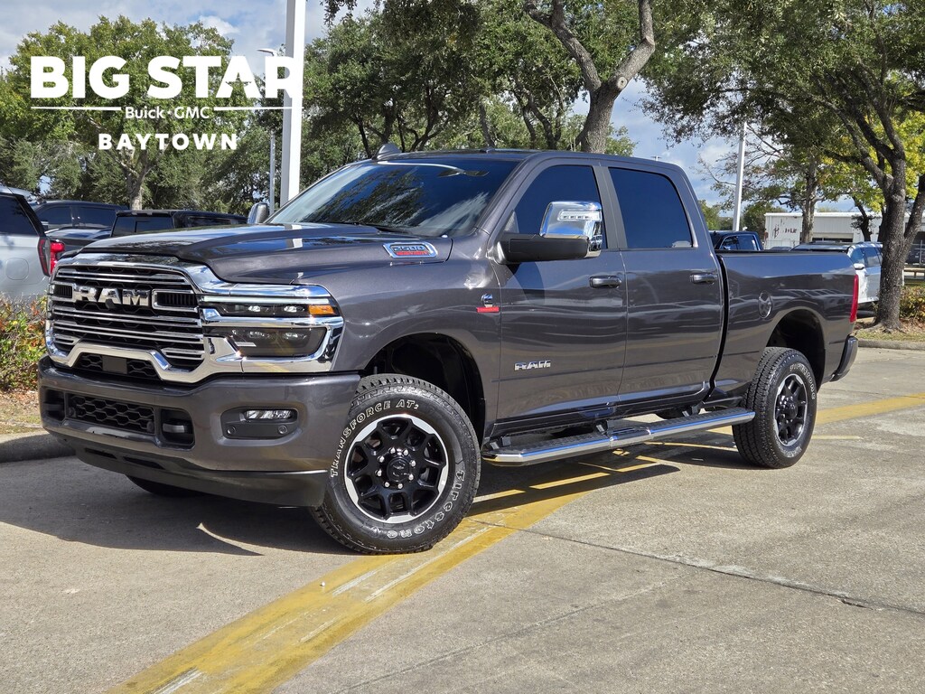 10 Speakers, 115V Auxiliary Rear Power Outlet, 120 Point Safety Inspection, 2 Way Rear Headrest Seat, 20 WHEELS, 2nd Row In Floor Storage Bins, 3.42 Axle Ratio, 4 Way Front Headrests, 4-Wheel Disc Brakes, 4G LTE Wi-Fi Hot Spot, 5th Wheel/Gooseneck Towing Prep Group, ABS brakes, Air Conditioning, Alexa Built-In, Alloy wheels, AM/FM radio: SiriusXM with 360L, Anti-Spin Differential Rear Axle, Apple CarPlay, Apple CarPlay/Android Auto, Auto Adjust In Reverse Exterior Mirrors, Auto Dim Exterior Mirror, Auto High Beam Headlamp Control, Auto Power-Folding Mirrors, Auto-Dimming Exterior Passenger Mirror, Auto-dimming Rear-View mirror, Automatic temperature control, Black Wheel Center Hub, BLUETOOTH / HANDSFREE, Brake assist, Bumpers: body-color, Chrome Exterior Mirrors, Chrome Flat Wheel-to-Wheel Side Steps, CLEAN CARFAX!, Compass, Connected Travel & Traffic Services, Connectivity - US/Canada, Delay-off headlights, Disassociated Touchscreen Display, Driver door bin, Driver vanity mirror, Dual front impact airbags, Dual front side impact airbags, Electronic Stability Control, Emergency Vehicle Alert System (EVAS), Exterior Mirrors Courtesy Lamps, Exterior Mirrors w/Heating Element, Exterior Mirrors w/Memory, Exterior Mirrors w/Supplemental Signals, Foam Bottle Insert (Door Trim Panel), Folding Flat Load Floor Storage, Forward & Reverse Utility Lights, Front anti-roll bar, Front Center Armrest w/Storage, Front dual zone A/C, Front fog lights, Front License Plate Bracket, Front reading lights, Front Seat Back Map Pockets, Fully automatic headlights, Garage door transmitter, Global Telematics Box Module (TBM), Gloss Black Grille Billets/Accents, Google Android Auto, GPS Antenna Input, GPS Navigation, HD Radio, Heated door mirrors, Heated Front Seats, Heated front seats, Heated Steering Wheel, Heated steering wheel, High Back Seats, Illuminated entry, Integrated Voice Command w/Bluetooth, Laramie Level 1 Equipment Group, Leather Trim 40/20/40 Bench Seat, LOCAL TRADE IN!, Low tire pressure warning, Manufacturer's Statement of Origin, Mirror Running Lights, NAVIGATION, Navigation System, NON SMOKER VEHICLE, Occupant sensing airbag, Outside temperature display, Overhead airbag, Overhead console, Panic alarm, ParkView Rear Back-Up Camera, Passenger door bin, Passenger vanity mirror, Power 2-Way Driver Lumbar Adjust, Power 2-Way Passenger Lumbar Adjust, Power Adjust 8-Way Driver Seat, Power Adjust 8-Way Front Passenger Seat, Power Adjust Mirrors, Power Adjustable Convex Aux Mirrors, Power Adjustable Pedals w/Memory, Power door mirrors, Power driver seat, Power Heated Fold Telescopic Mirrors w/Memory, Power passenger seat, Power steering, Power Telescoping Mirrors, Power windows, PROFESSIONALLY DETAILED FOR DELIVERY!, Quick Order Package 24H Laramie, Radio data system, Radio: Uconnect 5 Nav w/12.0 Display, Rain Sensitive Windshield Wipers, Rear 60/40 Folding Seat, Rear anti-roll bar, Rear reading lights, Rear seat center armrest, Rear step bumper, Rear window defroster, Remote keyless entry, Remote Tailgate Release, Security system, Selectable Tire Fill Alert, SiriusXM Radio Service, Speed control, Split folding rear seat, Steering wheel mounted audio controls, SUPER LOW MILES!, Tachometer, Tilt steering wheel, Traction control, Trip computer, Turn signal indicator mirrors, Variably intermittent wipers, Voltmeter, Wheels: 18 x 8.0 Diam Cut Alum w/Blk Pt Pock. Clean CARFAX. Certified.Big Star Buick GMC is delighted to offer this good-looking 2025 Ram 2500. Laramie 4WD Granite Crystal Metallic Clearcoat CARFAX One-Owner.Why should you buy from Big Star GMC Buick? Our unmatched service and diverse New and Used Buick, GMC, Cars and Trucks inventory have set us apart as the preferred dealer in Baytown. Visit us today to discover why we have the best reputation in the Baytown area. Advertised Prices do not include any dealer installed options and advertised prices exclude leases.