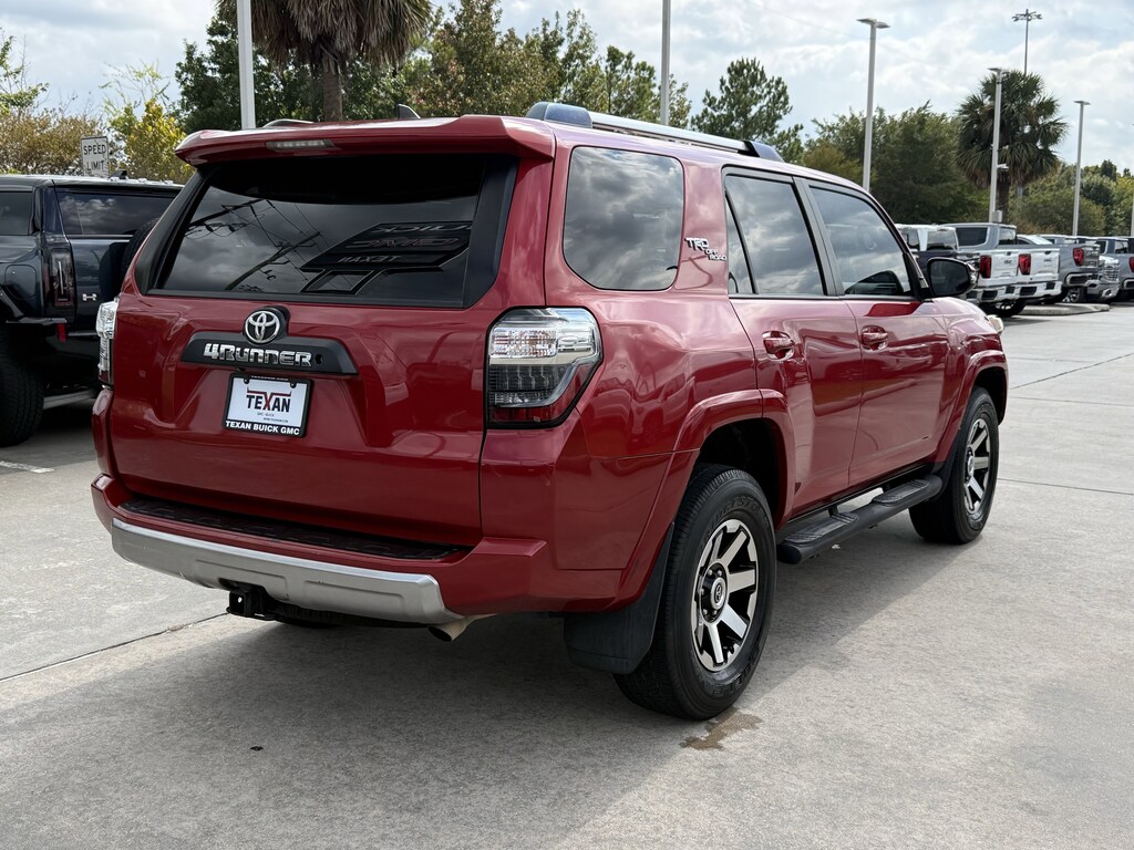 Recent Arrival! 3.727 Axle Ratio, 4-Wheel Disc Brakes, 8 Speakers, ABS brakes, Air Conditioning, Alloy wheels, AM/FM radio: SiriusXM, Anti-whiplash front head restraints, Black Roof Rails, Brake assist, Bumpers: body-color, CD player, Compass, Driver door bin, Driver vanity mirror, Dual front impact airbags, Dual front side impact airbags, Electronic Stability Control, Emergency communication system: Safety Connect, Exterior Parking Camera Rear, Fabric Seat Trim, Front anti-roll bar, Front Bucket Seats, Front Center Armrest, Front fog lights, Front reading lights, Front wheel independent suspension, Heated door mirrors, Illuminated entry, Knee airbag, Leather Shift Knob, Low tire pressure warning, Occupant sensing airbag, Outside temperature display, Overhead airbag, Overhead console, Panic alarm, Passenger door bin, Passenger vanity mirror, Power door mirrors, Power driver seat, Power steering, Power windows, Radio: Entune Audio Plus, Rear anti-roll bar, Rear seat center armrest, Rear window defroster, Rear window wiper, Remote keyless entry, Roof rack: rails only, Security system, Speed control, Speed-sensing steering, Split folding rear seat, Spoiler, Steering wheel mounted audio controls, Tachometer, Telescoping steering wheel, Tilt steering wheel, Traction control, Trip computer, Variably intermittent wipers, Wheels: 17 x 7.5 7-Spoke Unique Off-Road Alloy.Texan GMC Buick is proud to offer this good-looking 2017 Toyota 4Runner TRD Off-Road. 4WD Barcelona Red MetallicCertified. Odometer is 29416 miles below market average!Priced below KBB Fair Purchase Price!Awards: * 2017 KBB.com Best Resale Value Awards * 2017 KBB.com 10 Most Awarded BrandsService Loaners...Free WiFi.....Business Center....Roadside Assistance...All Included!! Our Mission: To be the most esteemed automotive group in the eyes of our employees, customers, and partners. Our Promise: We listen and provide a trusted, easy, and enjoyable experience. Our Philosophy: We create lifetime customers. Advertised Prices do not include any dealer installed options and advertised prices exclude leases.