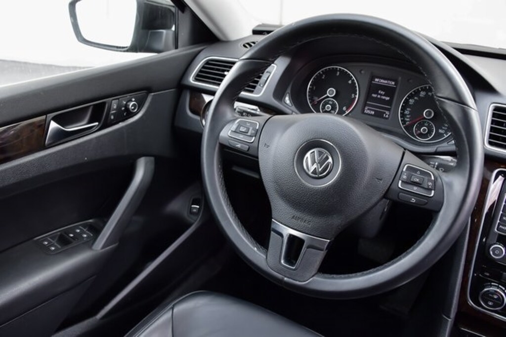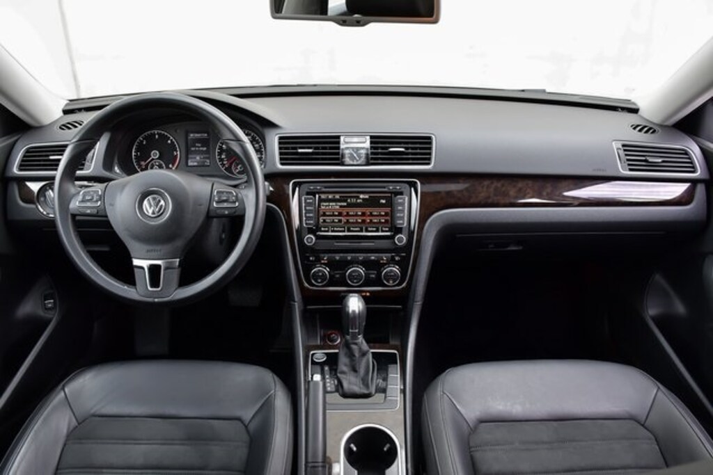 * The 2014 Volkswagen Passat has balanced proportions and an elegant, premium quality. Your eyes follow the strong character line and continue around the whole vehicle. With convenient features like automatic headlights combined with available corner-illuminating foglights, this is a sedan that will be not be outshined. Other convenient features include optional keyless access with push button start and remote start to preheat or cool your Passat. Step inside and you will find available soft leather to soothe you, and on select models, the comfort of heated front seats. Plus, for 2014 you can get two-tone seats in SE models. There is even an available sunroof to let the open sky in. With the best-in-class rear legroom your passengers will also enjoy the choice you've made with the Passat. You have several engine options with the Passat, including a 170-horsepower, turbocharged 1.8-liter gas four-cylinder, which is new for 2014. There is also a range of transmission possibilities, and available on select models, a 6-speed dual-clutch DSG automatic transmission with Tiptronic for imperceptibly fast gear changes and seamless acceleration. Depending on your engine and transmission combination, you can get EPA estimated gas mileage that ranges from 20-31 in the City and 28-43 on the Highway. The Passat lets you make calls hands-free, and stream music wirelessly from your compatible phone. For more technology, available on select models, get turn-by-turn directions from the navigation system, or rock out to the sound of your favorite music on the Fender Premium Audio System. In addition, for 2014, you can have a backup camera on SE trims and higher. Safety features include the Intelligent Crash Response System, which in the event of an accident, automatically shuts your fuel pump off, turns your hazard lights on, and unlocks your doors. In addition, all Passat trims come standard with anti-lock brakes and electronic stability control. Source: The Manufacturer Summary