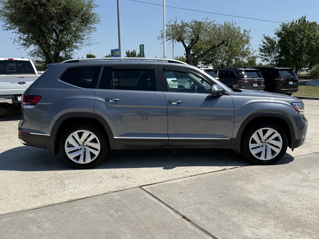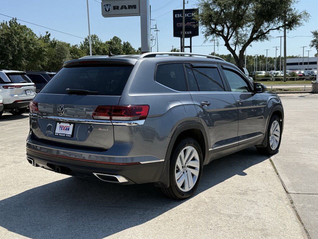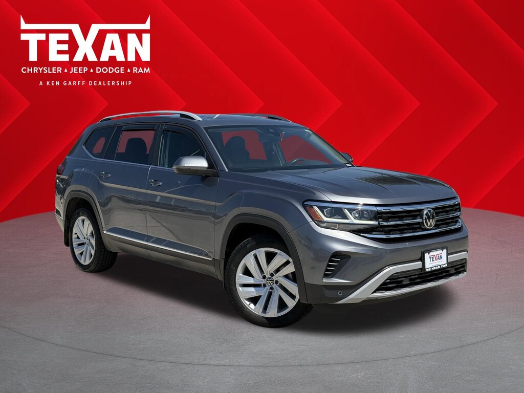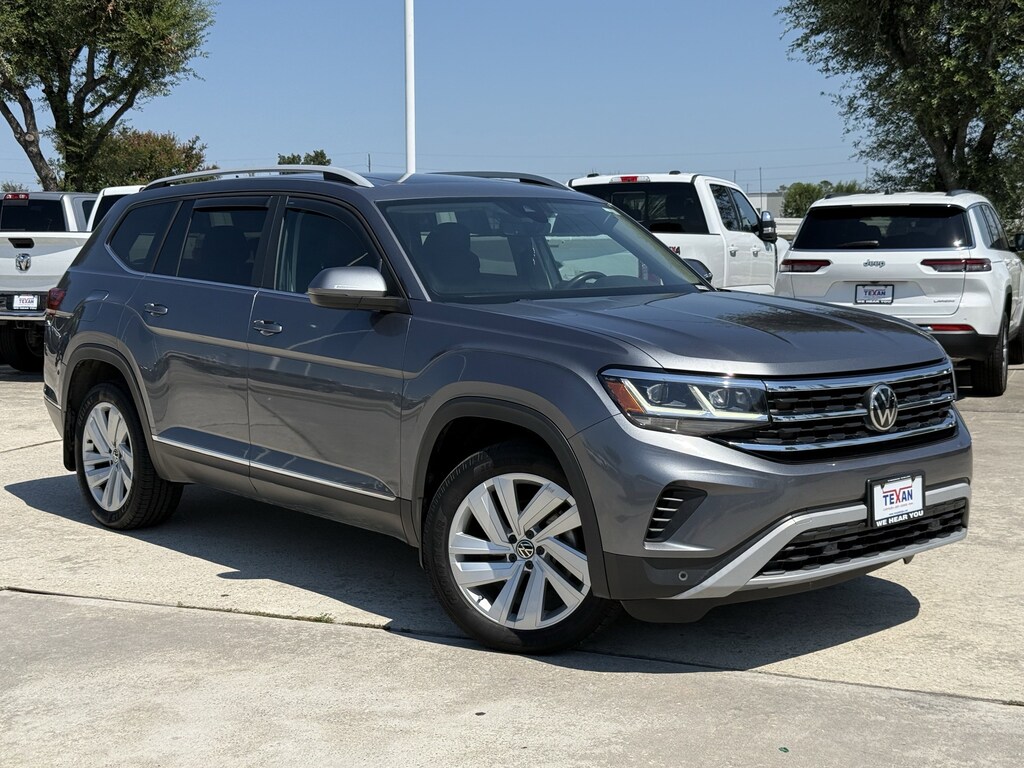 Non Smoker Vehicle, LOCAL TRADE, ALL VEHICLES UNDERGO A 115 POINT SAFETY INSPECTION, Carfax 1 Owner, 3.60 Axle Ratio, 3rd row seats: split-bench, 4-Wheel Disc Brakes, 6 Speakers, ABS brakes, Auto High-beam Headlights, Auto-dimming Rear-View mirror, Automatic temperature control, Brake assist, Bumpers: body-color, Compass, Delay-off headlights, Driver door bin, Driver vanity mirror, Dual front impact airbags, Dual front side impact airbags, Electronic Stability Control, Emergency communication system: VW Car-Net services (capabilities require enrollment or subscription), Exterior Parking Camera Rear, Four wheel independent suspension, Front anti-roll bar, Front Bucket Seats, Front Center Armrest, Front dual zone A/C, Front fog lights, Front reading lights, Fully automatic headlights, Heated Comfort Front Bucket Seats, Heated door mirrors, Heated front seats, Heated steering wheel, Illuminated entry, Leather Shift Knob, Low tire pressure warning, Memory seat, Occupant sensing airbag, Outside temperature display, Overhead airbag, Overhead console, Panic alarm, Passenger door bin, Passenger vanity mirror, Perforated V-Tex Leatherette Seating Surfaces, Power door mirrors, Power driver seat, Power Liftgate, Power moonroof, Power passenger seat, Radio data system, Rain sensing wipers, Rear anti-roll bar, Rear reading lights, Rear seat center armrest, Remote keyless entry, Roof rack: rails only, Security system, Speed control, Speed-sensing steering, Split folding rear seat, Spoiler, Standard Suspension, Steering wheel mounted audio controls, Telescoping steering wheel, Tilt steering wheel, Traction control, Turn signal indicator mirrors, Variably intermittent wipers, Wheels: 20 5-Spoke Silver Alloy. New Price! Priced below KBB Fair Purchase Price!Texan Dodge Chrysler Jeep Ram is pumped up to offer this fantastic 2021 Volkswagen Atlas SEL.In addition to transparent, no hassle pricing and upfront no hassle trade evaluation.....We provide an enjoyably brief and easy Sales Experience...Your Pace...Your Way....CONTACT US AT (281)359-7100 Advertised Prices do not include any dealer installed options and advertised prices exclude leases.